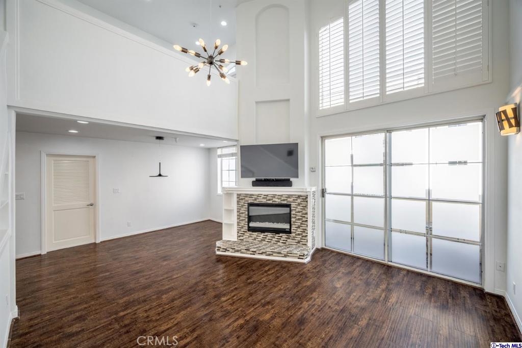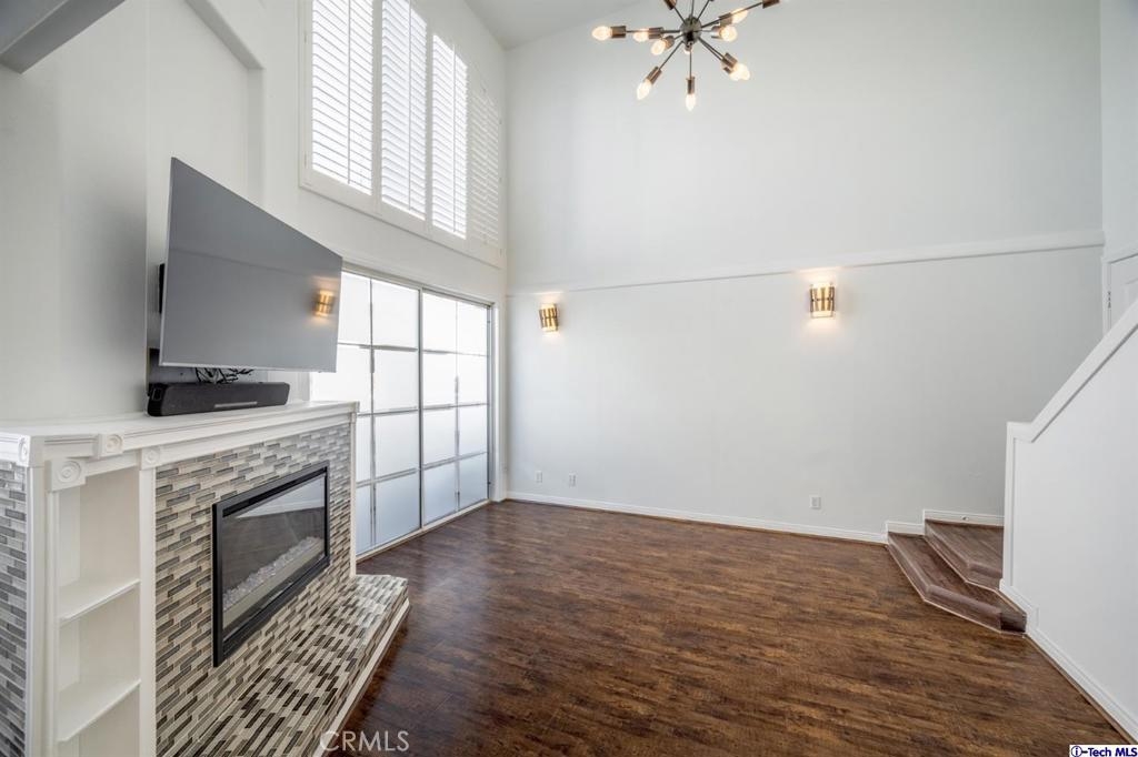 This beautiful condo is a corner unit and offers a spacious floorplan in a great location. As you step in you feel the openness with the ultra high vaulted ceilings, a step down living room with a modern fireplace and direct access to the balcony. The dining area is open to the living room and kitchen. This kitchen is modern with beautiful Quartz countertops, a breakfast bar and lots of cabinetry. Off the hallway is the laundry closet, two large bedrooms both with high ceilings & tree top views. The primary includes an attached large bath. The oversized upstairs loft is perfect for office space or extra room for a guest. This location is central to SoFi Stadium, You Tube Theater, Los Angeles Airport, central to beach cities and the 405 freeway. There are two designated tandem parking spots in the gated garage. Restaurants, grocery and Amazon store close by. Amenities include a complex gym, new HVAC, new modern electric fireplace with remote, Samsung TV with sound bar included in the sale.