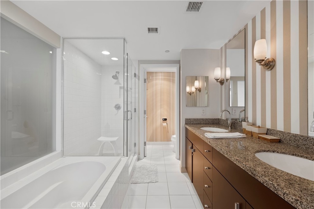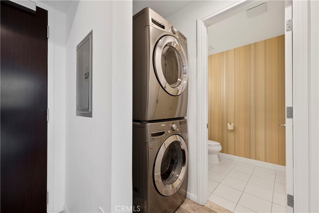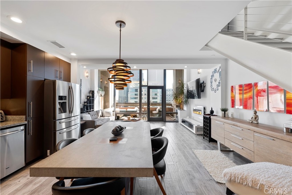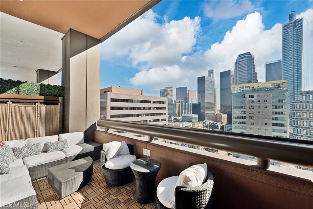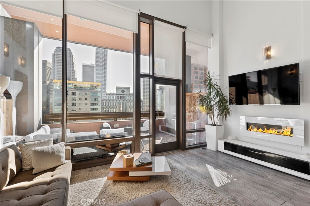Experience rare luxury living in the heart of Downtown LA with this stunning two-story loft at 1100 Wilshire Blvd. One of only nine exclusive two-level lofts in the building featuring a private balcony, Unit 1707 offers sweeping skyline views and an exceptional indoor-outdoor lifestyle rarely found in DTLA high-rises. This 1 bed, 2 bath loft spans approximately 1,080 sq. ft., showcasing soaring ceilings, dramatic floor-to-ceiling windows, and modern hardwood flooring. The open-concept kitchen features granite countertops, European-style cabinetry, and GE Profile stainless steel appliances. The upper-level bedroom includes a spacious walk-in closet and a spa-inspired ensuite with a soaking tub, dual vanities, and a separate shower. Enjoy unobstructed city views from your private balcony, and take advantage of unparalleled access to resort-style amenities—the unit sits on the same level as the 17th-floor Sky Deck, offering a rooftop pool, spa, cabanas, BBQ area, and fire pit just steps from your front door. Additional features include direct access to the parking elevators, in-unit laundry, and two parking spaces—one reserved with EV charging ready. This full-service building also includes 24-hour front desk/security, a fitness center, conference/media rooms, and a dog run. Located near LA Live, Whole Foods, Crypto.com Arena, and public transit, this rare offering combines modern comfort, urban convenience, and iconic views—perfect for professionals, creatives, or investors seeking a prime DTLA residence.