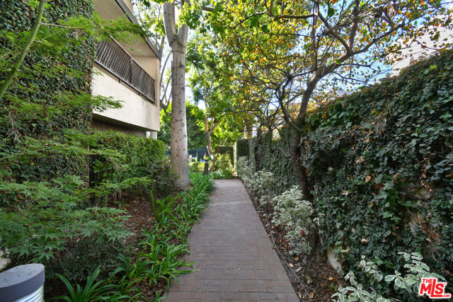 Welcome to Bel Air Courtside Condominiums, an exclusive 16-unit building surrounded by greenery and offering beautifully landscaped grounds, a swimming pool, and a rooftop tennis court. Private patio courtyard entry opens to the front porch and patio. From the courtyard, a glass front door leads into the inviting living space with multiple sitting areas, a mantled fireplace, hardwood floors, wet bar, and sliding glass doors to the front patio. The kitchen includes a breakfast area, glass front cabinets, pantry, and opens to the formal dining room. Thoughtful floor plan to enjoy everyday living or entertaining guests. There are two en-suite bedrooms, including the primary bedroom with a walk-in closet and spacious bathroom featuring double sinks, a large soaking tub, and separate shower. Both bedrooms have glass doors that open to a large backyard patio and garden with a fountain. Additional features include great storage space and extra closets throughout, indoor washer and dryer area, and a guest half bathroom. Elevator or stairs lead to side-by-side parking spots with a personal EV charger. A unique place to call home in a great Bel Air/Brentwood location near the Getty Museum. Easy access to everything!