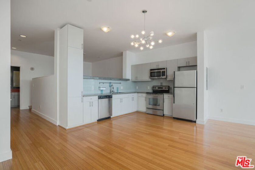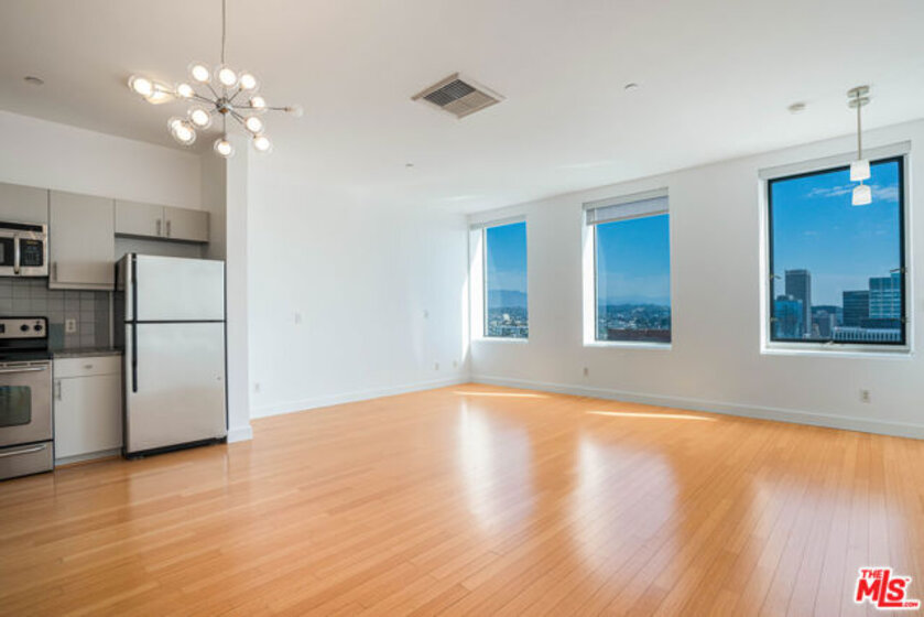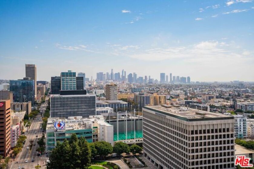 Peaceful, quiet 19th floor open floor plan apartment with lofted bedroom that overlooks the great room and Eastern view with enormous windows. This bright and cheerful 830 sq ft apartment features additional walk-in closet with custom lifted clothing bar. LG Smart washer/dryer is in laundry closet. Bathroom features orange Corian countertop and inset Kohler sink, set off by grey accent wall. Bathroom features grab bars in Kohler soaking tub/shower. All floors are bamboo; there is no carpeting. Unlike most 1 bedroom apartments, 1906 includes two deeded parking spaces. Only one wall is adjacent to another unit, as it is at end of hall way next to emergency fire stairwell. Sunrise is stunning; sunset is reflected as jewels on nearby glass buildings. Kitchen features GE stainless steel appliances and abundant storage. SkyDeck on roof features heated pool, spa, lounges, dining tables and chairs, barbeques, shade structures, fully equipped gym, restrooms, wifi and a no-pet lawn open from 5am to midnight. While in the pool you can see the ocean, downtown, and the Hollywood sign. Building has CCTV, gorgeous lobby has 24/7 staffing at front desk, and package room. Office of General Manager is on site. THE MERCURY was built by Getty Oil in 1962 by Claude Beelman using the most modern and expensive materials. It was converted into condominiums in 2006. HOA is low, building financials are strong. Subway is across the street, as are buses to Santa Monica, Malibu, downtown, Griffith Park and more. The Wiltern Theater is across the street; many trendy restuarants within a two blok walk. MaDang Plaze with multiplex is block away, as are two grocery stores. There is an assumable $156,000 mortgage at 2.75%.