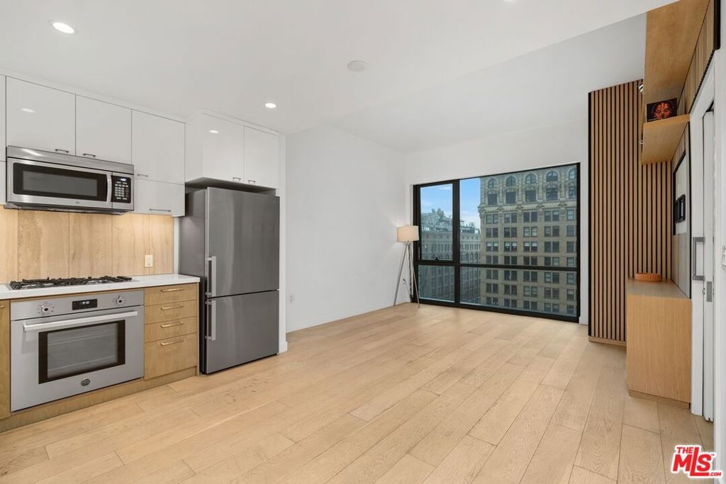 Experience elevated urban living at Perla on Broadway, one of Downtown LA's most sought-after luxury high-rises. This beautifully upgraded 1-bedroom, 1-bath residence offers 751 square feet of refined comfort with sweeping views of the city skyline. Thoughtful custom touches create a home that feels modern and exceptionally functional. The elegant wood slat wall with integrated shelving, the tailored closet system, the designer bedroom drapery, and the built-in home office all add intentional style and utility. Wide-plank hardwood floors and floor-to-ceiling windows bring warmth and natural light into every corner. The kitchen features polished quartz countertops, a sleek porcelain backsplash, and high-end Bertazzoni appliances. The spa-inspired bathroom is your personal retreat, complete with a deep soaking tub, Kohler fixtures, and curated finishes that elevate your daily routine. An assigned parking space offers everyday convenience. Residents at Perla enjoy world-class amenities that redefine luxury living. Highlights include a rooftop pool, a yoga deck, a state-of-the-art fitness center, a wine tasting room, a private theater, a game room, co-working lounges, dog parks, a pet spa, and 24-hour concierge and security. Step outside and you are only moments from Grand Central Market, the Bradbury Building, Pershing Square, and many of Downtown LA's best dining, shopping, and cultural destinations. This is more than a home. It is a vibrant lifestyle waiting for you. Do not miss your chance to call Perla yours.