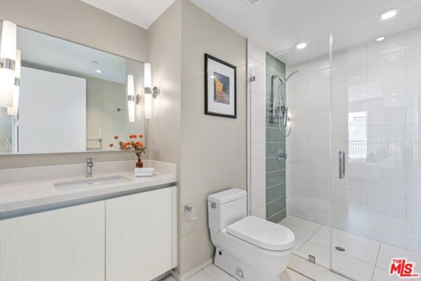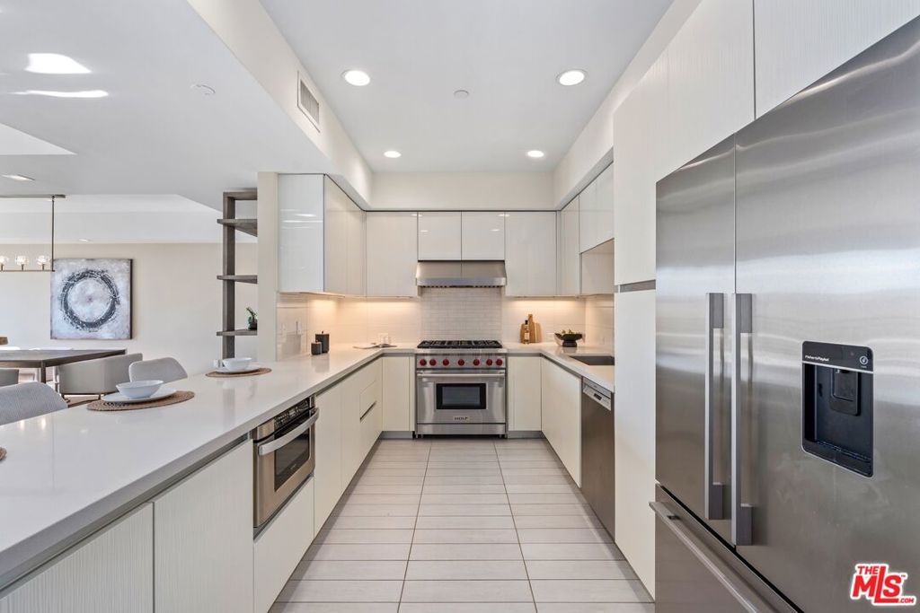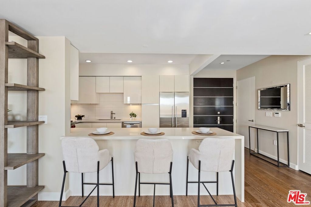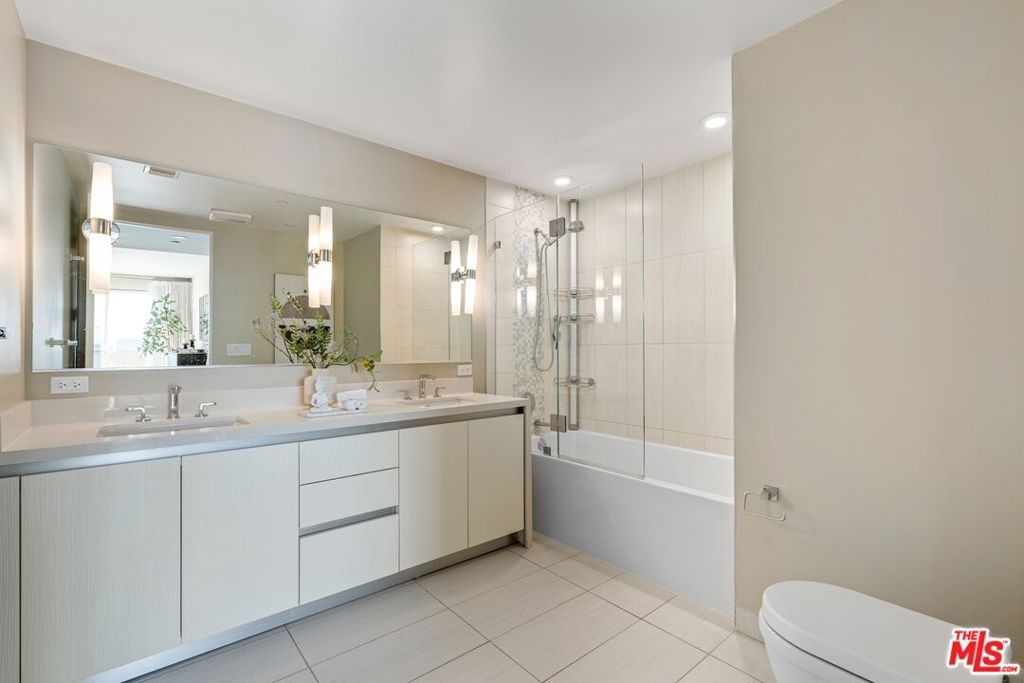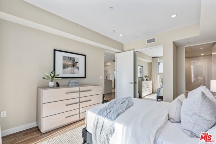 Experience elevated Brentwood living in this refined residence within a full-service luxury building. The Cosmopolitan BW offers 24/7 concierge and a full-service front desk, and is home to an elegant 2-bed, 2.5-bath residence with a spacious open layout, intentional accent lighting, wide plank oak wood floors, and expansive windows. The generous living space extends to a small private balcony and a sizable dining area that can comfortably seat up to eight. The gourmet kitchen features top-of-the-line stainless-steel Fisher & Paykel and Bosch appliances, a Wolf range, sleek white cabinetry, a large island with bar seating, and ample counter space. An in-unit washer/dryer adds everyday convenience. Both bedrooms include ensuite baths, while the primary suite elevates comfort with a soaking tub, dual vanities, and a large walk-in closet. Residents enjoy premium amenities including a state-of-the-art fitness center, heated pool, outdoor lounge with fire pit, and a tranquil meditation garden.Just moments from top-rated schools, acclaimed restaurants, boutique shopping, and the iconic Brentwood Country Mart, this home offers a sophisticated and effortless Brentwood lifestyle.
