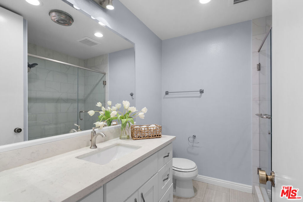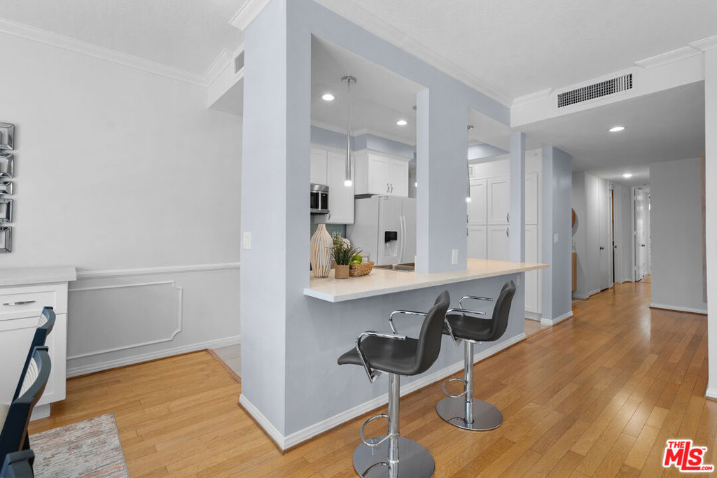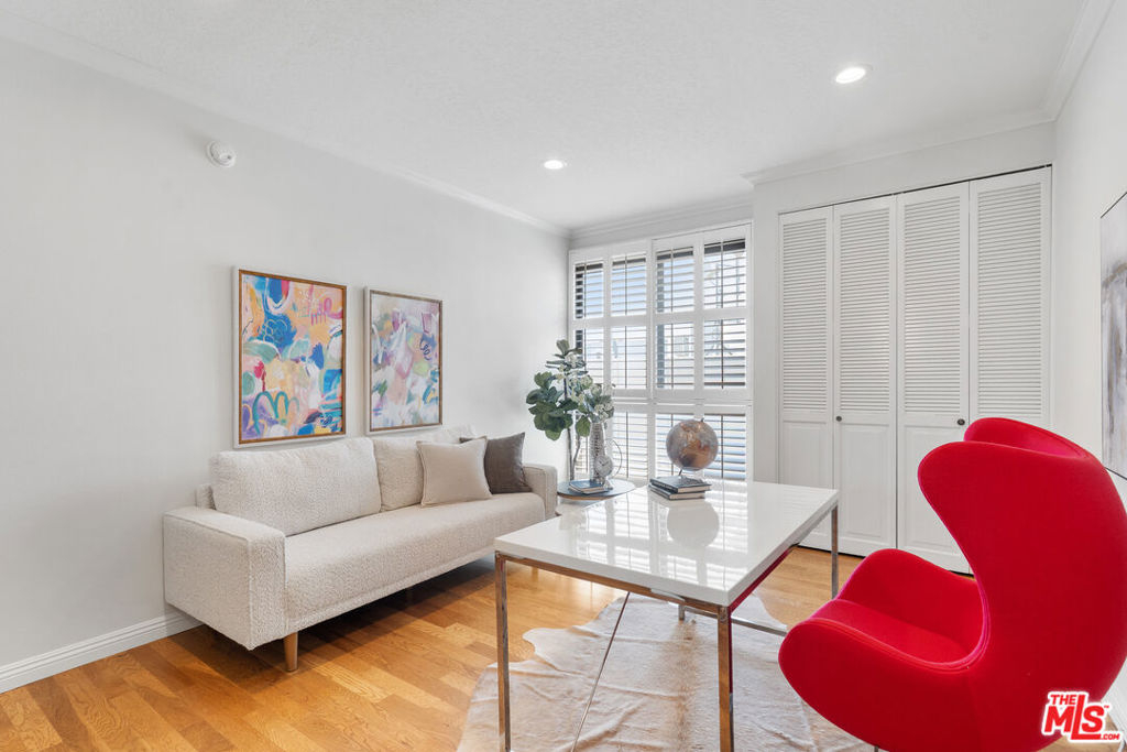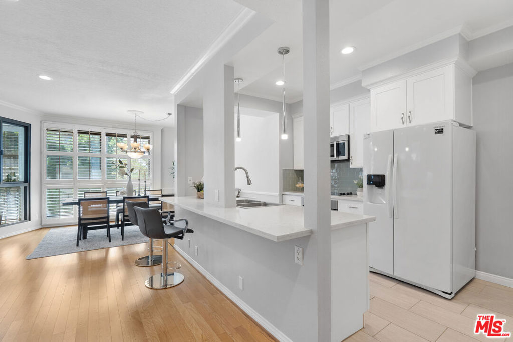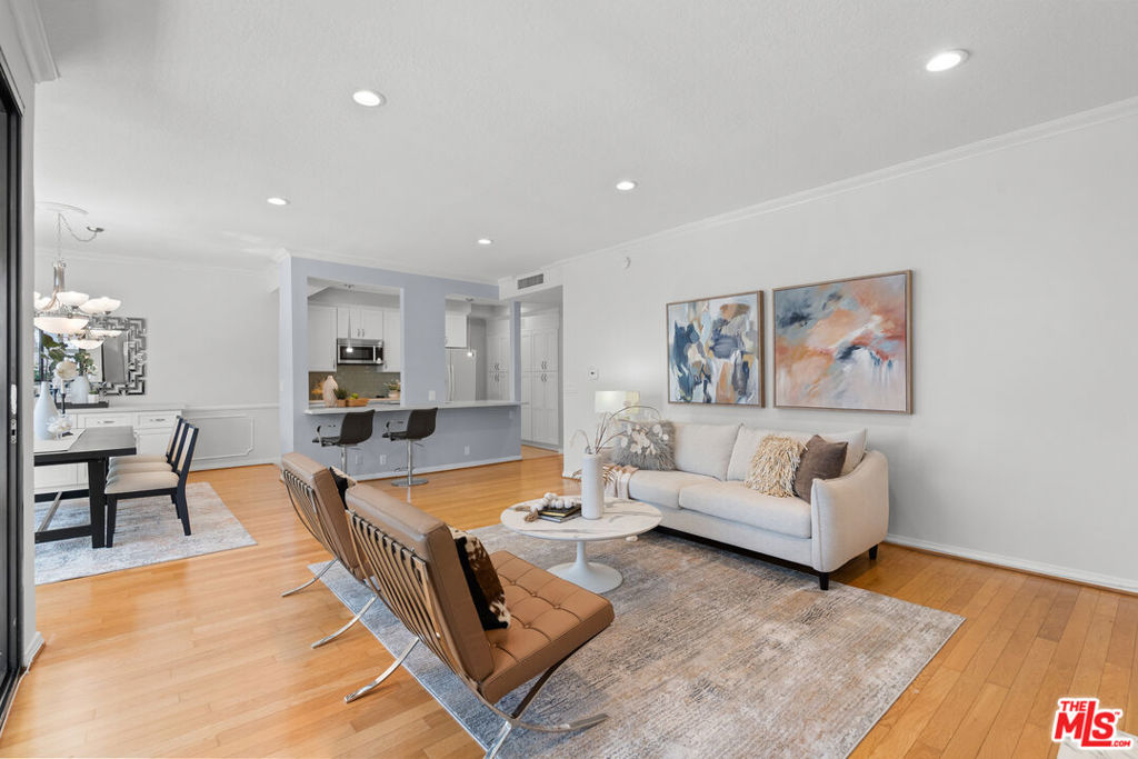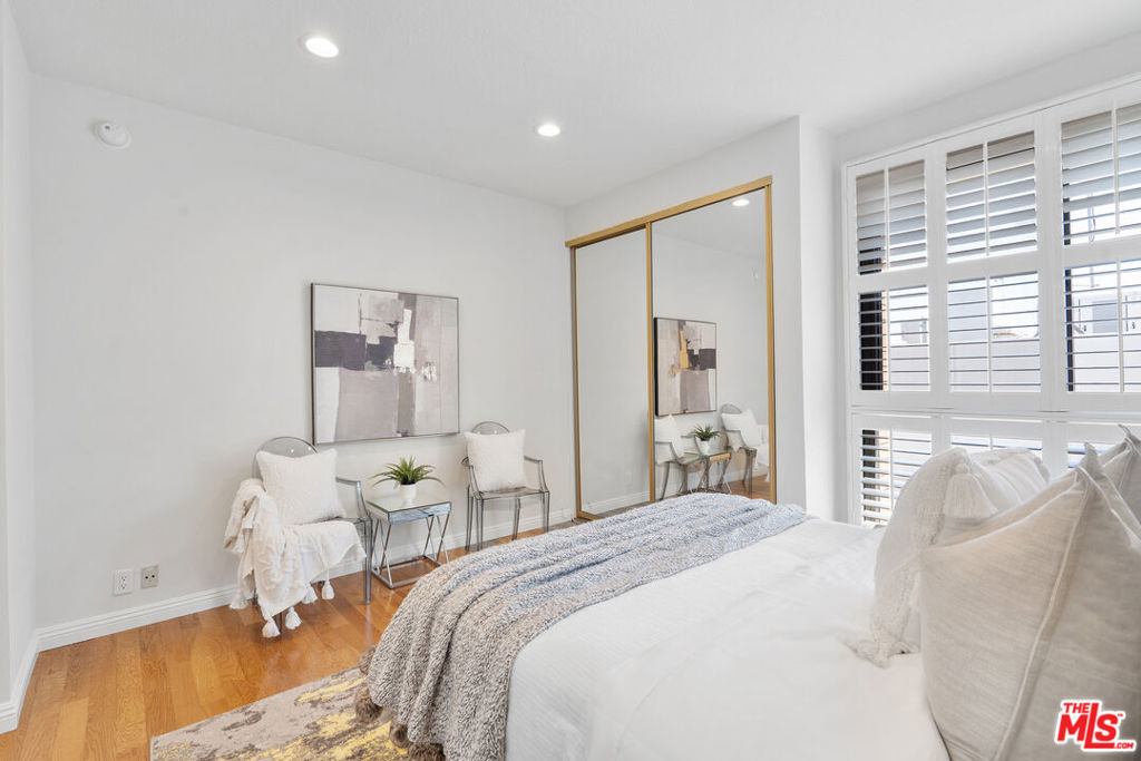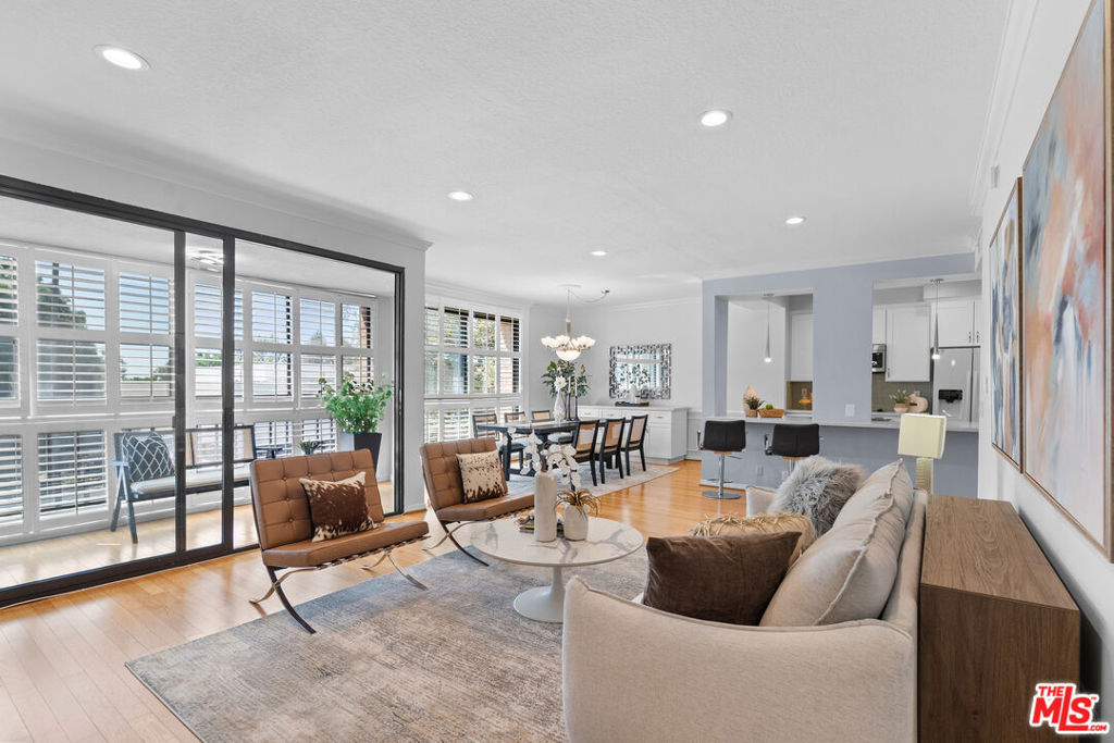 Experience luxury living in this beautifully remodeled 3 bed, 3 bath top-floor southeast-facing corner unit in a prestigious Hancock Park complex. Thanks to its unique position, only one shared walls with neighboring units, offering exceptional privacy and abundant natural light throughout. With nearly 1,800 sq ft of thoughtfully designed space, the open-concept layout features recessed lighting, hardwood flooring, and floor-to-ceiling windows that flood the home with light. The living room boasts a cozy decorative fireplace and an atrium-style glass-enclosed balcony ideal for morning coffee or evening relaxation.The remodeled kitchen is a chef's dream, featuring quartz countertops, a spacious island that opens to the living area, and premium Bosch appliances. Additional custom cabinetry lines the kitchen and dining area, offering ample storage and superb functionality. Every window is fitted with classic wood plantation shutters, and the entire interior has been freshly painted for a modern, inviting atmosphere. The primary suite is generously sized with a walk- in closet and spa-inspired bath with double vanities, a soaking tub, and a separate shower. Two additional bedrooms also enjoy great closet space and easy access to full baths. Extras include in-unit laundry, two side-by-side parking spaces, and a large private storage unit. Community amenities include security, a heated pool, spa, sauna, clubhouse, and fitness center. Located within the desirable Third Street Elementary School District, this home is close to the best of Hancock Park dining, shopping, and more. This is a rare opportunity to own a top-floor, sun-drenched, corner unit with unmatched privacy in one of LA's most sought-after neighborhoods.