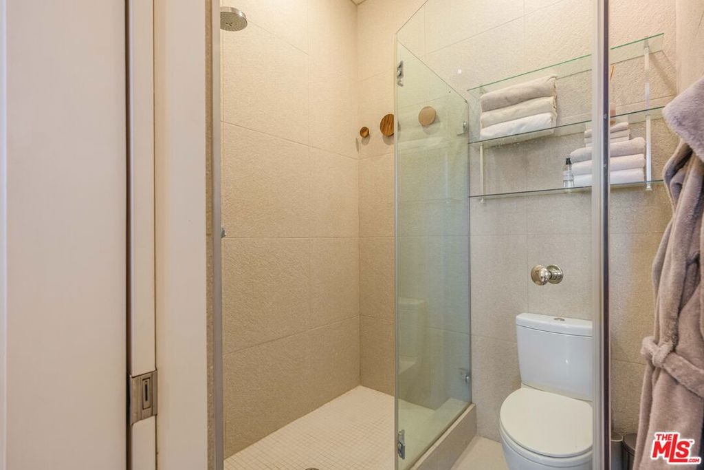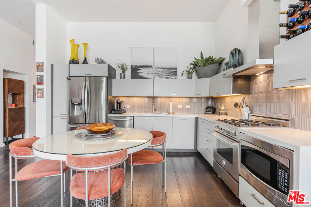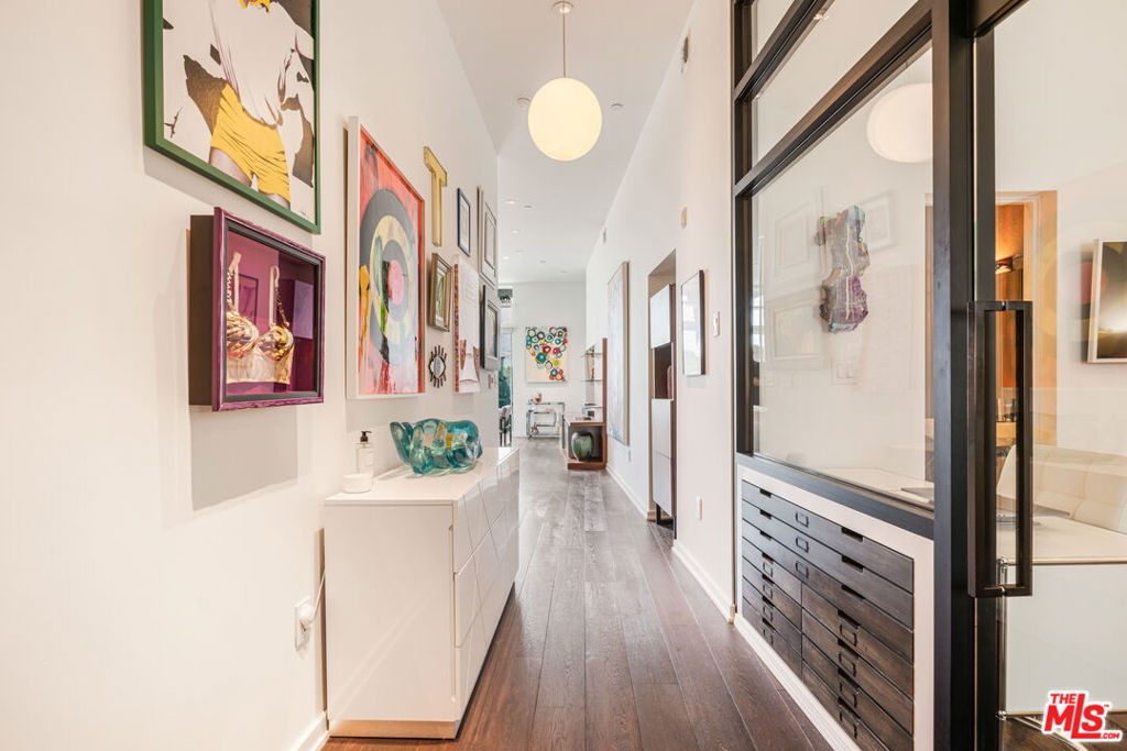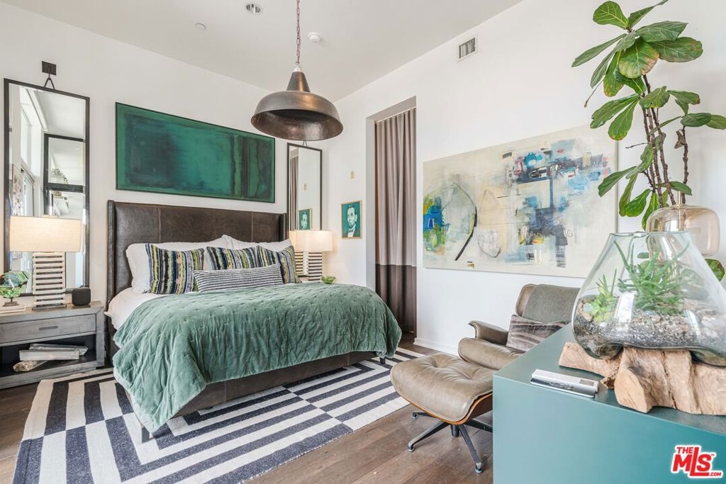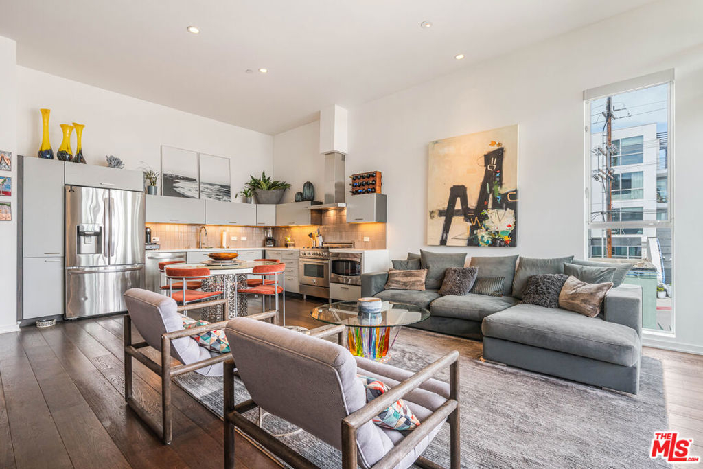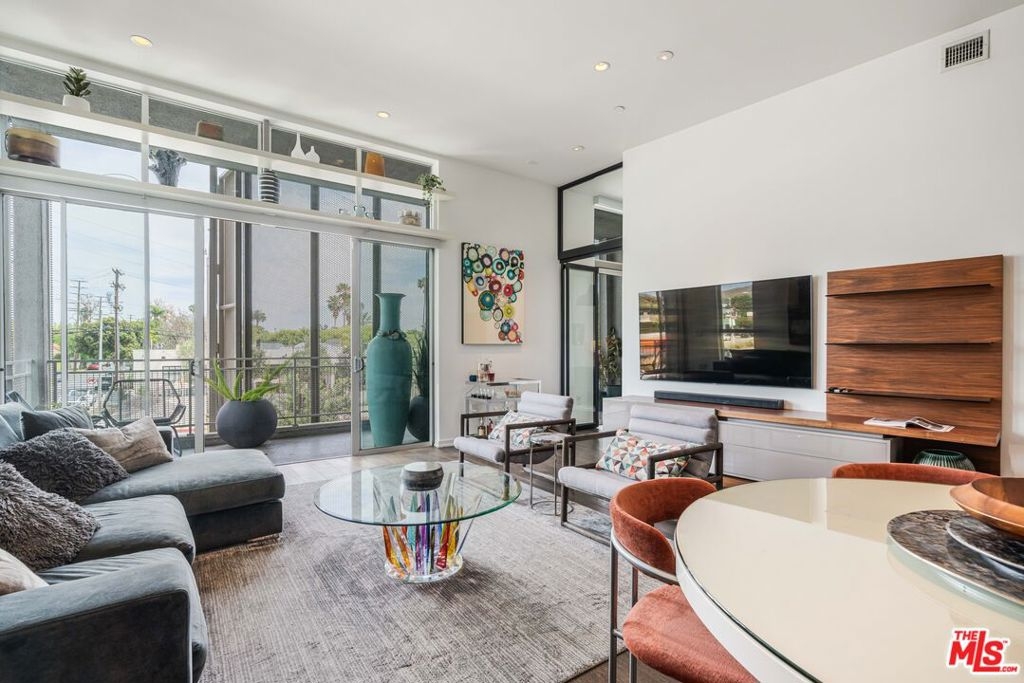 Welcome to the iconic Lofts at Cherokee Studios, this sophisticated two-bedroom, two-bath residence blends modern luxury with a storied entertainment legacy. The historic property occupies the former sites of Cherokee Recording Studios and MGM Studios, where legends such as Frank Sinatra, David Bowie, and Michael Jackson once recorded. Designed by acclaimed architects Pugh + Scarpa, the building represents one of the first environmentally conscious developments to achieve Platinum LEED certification, incorporating features such as solar panels, passive cooling design, drought-resistant landscaping, and a communal rooftop deck. Positioned as a rare single-level corner residence and one of only two of its kind, the east-facing home showcases an airy, open-concept layout framed by expansive glass walls that open to a generous private terrace with treetop and Hollywood Hills vistas. Approximately 11-foot ceilings further amplify the volume of the living and sleeping spaces, while warm wood flooring extends throughout. The kitchen is appointed with premium stainless-steel appliances, including a Bertazzoni range along with newer LG refrigerator and dishwasher. The primary suite includes a spacious custom walk-in closet and an elegant ensuite bath, complemented by additional spa-inspired bathrooms and automated window treatments. A private balcony with dedicated storage offers added functionality and a peaceful outdoor escape. Residents also enjoy access to a rooftop deck with sweeping 360-degree views, two separate subterranean parking spaces featuring a newly installed electric vehicle charger, and in-unit laundry. Ideally located with a Walk Score of 94, the home sits close to Melrose Avenue, Whole Foods, and an array of notable dining and entertainment options, presenting a rare opportunity to own a sustainable, design-forward loft in the heart of Hollywood with just about anything you could look for within walking distance.